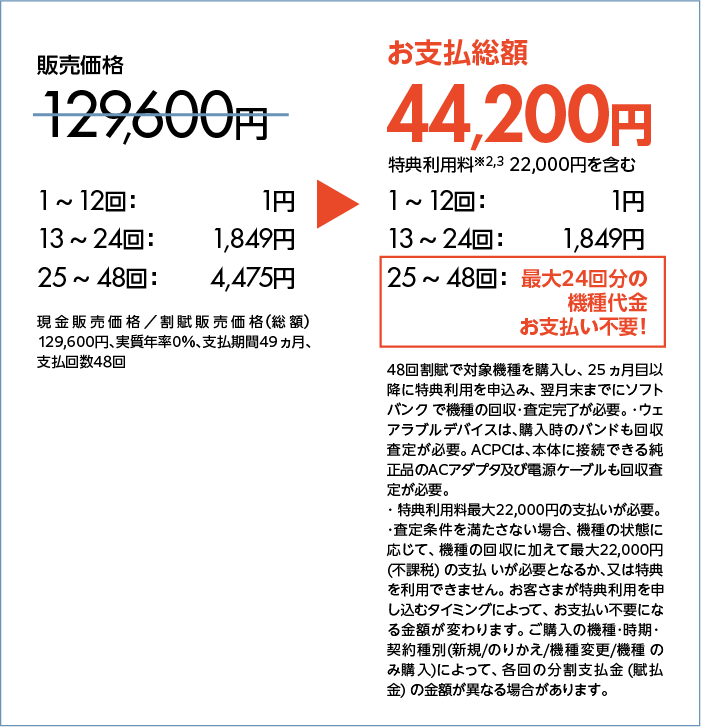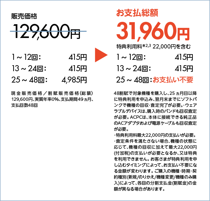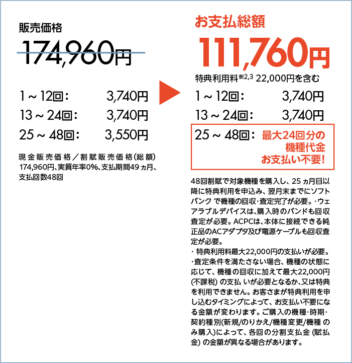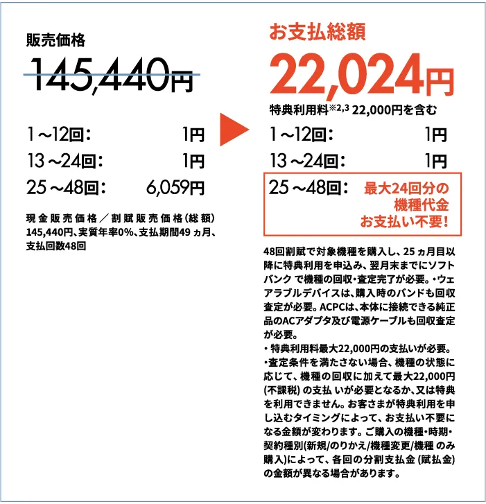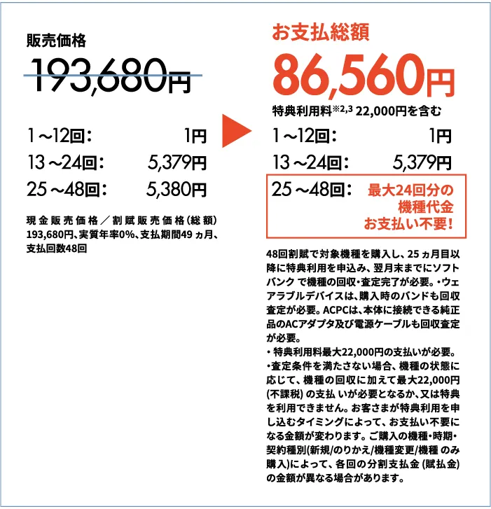 ① 本キャンペーン期間内に、「ソフトバンクオンラインショップ(公式)」(店舗受け取りサービスをのぞきます。)または「ワイモバイルからソフトバンクへののりかえ専用サイト」で当社が定める支払回数により対象機種を購入すること