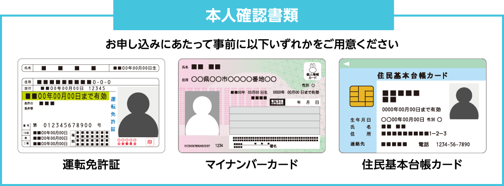 本人確認書類 お申し込みにあたって事前に以下いずれかをご用意ください 運転免許証 マイナンバーカード 住民基本台帳カード