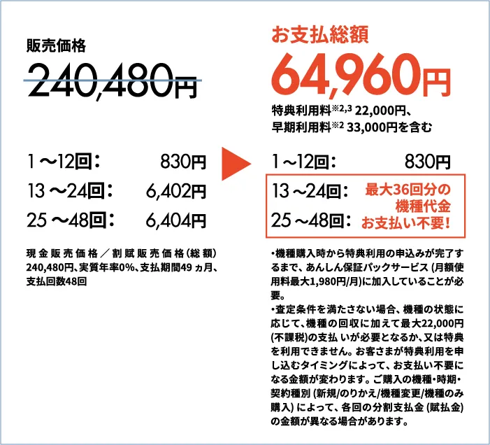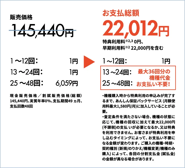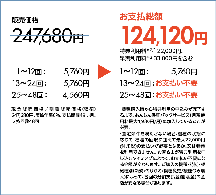 ・特典A利用の場合、あんしん保証パックサービス※4(月額使用料最大1,980円/月※5)への加入が必要です。一部対象外機種あり。