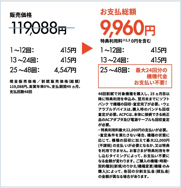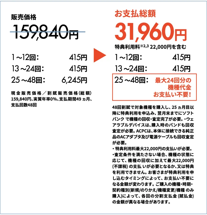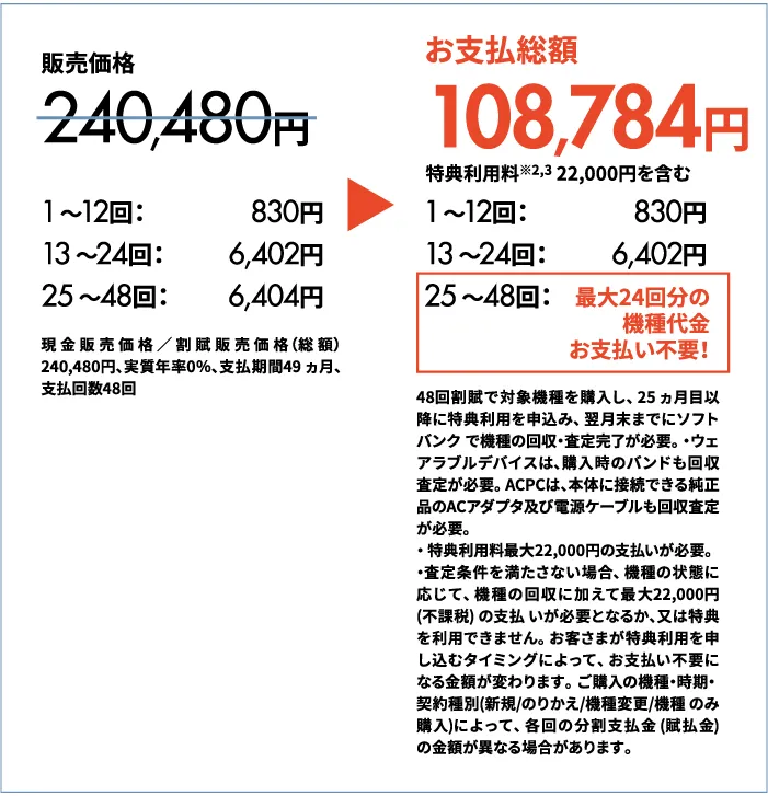 【新トクするサポート+(特典B)】※お申し込み状況等によって、時期が前後にずれることがあります。お客さまの特典受付開始日は、My SoftBank等でご確認いただくことができます。【対象機種】・当社ホームページをご確認ください。※2025年9月12日時点の金額です。特典利用料、早期利用料及びあんしん保証パックサービスの金額は、変更される場合があります。最新の金額は、WEB又はクルーまで。【特典内容】・特典Bの申込日が属する請求月の翌請求月以降分(最大24回分)の機種の分割支払金・賦払金(頭金は対象外)のお支払いが不要になります。※何らかの理由により査定が遅れ、特典利用の申込日が属する月の翌月末までに査定を完了することができなかった場合に、お客さまが査定完了時期以外の全ての特典利用条件を満たすことを条件として、特典の申込日が属する月の翌月末から60日以内に査定が完了しているときに限り、例外的に当社の判断により特典の適用を認めることがあります。この場合、お支払いが不要になる対象は、査定完了日が属する請求月以降分となります。但し、査定完了後に古物営業法に基づく本人確認を行う法人のお客さまに関しては、本人確認のために講ずる措置の完了を当社が確認できた日が属する請求月以降分です。【特典利用条件】次の条件を全て満たすことが必要です。➀25ヵ月目※以降に、電話番号(ソフトバンクユーザー)又は機種契約番号(ソフトバンクユーザー以外)を申告の上、特典の利用を当社に申し込むこと※お申し込み状況等によって、時期が前後にずれることがあります。お客さまの特典受付開始日は、My SoftBank等でご確認いただくことができます。②特典Bの利用の申込日が属する月の翌月末までに、当社が機種を回収し、査定完了すること。③機種が査定基準を満たしていること、又は査定基準を満たしていないとき※は、最大22,000円を支払うこと※特典Bの利用を申し込みするときに、機種が査定基準を満たしていない場合であっても特典を利用することを希望する旨を当社に申し出ることが必要です。※査定の結果、当社が定める特典対象外条件に該当する場合、特典 B の適用は受けられません。④査定完了後に一括で特典利用料を支払うこと※特典利用料の金額は、ご購入の機種・ストレージ容量・時期・価格・契約種別等により異なります。※特典利用料は、お客さまが特典Bを利用するまでに経過する月数によって変動する金額が設定されています。⑤プログラムを解約、解除又は終了していないこと⑥当社に負担する債務の支払いを怠っていないこと⑦機種がネットワーク利用制限の対象になっていないこと【査定基準を満たしていないときの費用】査定基準を満たしていないときにお支払い頂く金額(以下「負担金」)は、下取りする機種の25~48回目の分割支払金・賦払金(税込)の合計額によって異なり、以下のとおりです。7万円以上の場合:22,000円(不課税)7万円未満の場合:12,000 円(不課税)・ウェアラブルデバイスの場合、本体が査定基準を満すものの、バンドのみが査定基準を満たさないとき:2,000円(不課税)のお支払いが必要。・ACPCの場合、本体が査定基準を満たすものの、ACアダプタ又は電源ケーブルのみ査定基準を満たさないときは 5,000円(不課税)のお支払いが必要。【適用除外事由】査定基準を満たしていない場合に、特典利用料及び負担金を合計した金額がお支払い不要となる金額より、大きいとき又は同額であるときは、特典Bを利用することができません。【特典利用料】・特典Bの特典利用料の金額は、以下のとおりです。<下記①及び②の金額を比較して、いずれか少ない方の金額①お支払い不要となる金額(税込)に95%を乗じた金額②当社ホームページに定める金額※(税込)※お客さまが対象機種を購入する時点で当社ホームページに定められた金額が適用されます。> 【査定基準】・本プログラムの専用ウェブサイトに定める査定時点における最新の判定基準を適用します。・査定により、液晶・タッチパネルに異常が確認された場合や当社ホームページに記載の特典対象外条件に該当する場合は、特典をご利用いただけません。【終了条件】・機種の割賦債務を完済した場合又は一括弁済の申し込みをした場合は、本プログラムの適用を終了します。【その他注意事項】・特典A、特典B又は1年くりあげオプションのいずれかの利用を申し込みした場合、その申込みを撤回又は取消しすることはできず、また再度利用を申込みすることもできません。この場合、別の種類の特典についても申込みすることはできなくなります。・機種の回収時に、古物営業法に基づく本人確認を実施します。・新トクするサポート+の加入時及び特典利用時のいずれも下取りプログラムを利用することはできません。【プログラム期間】2025年8月20日~終了時期未定 終了時期は、ソフトバンクホームページ等でご案内します。