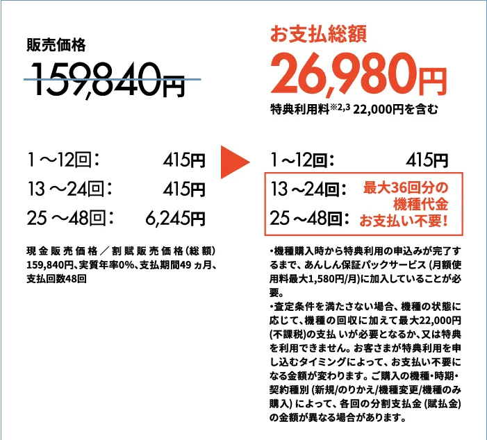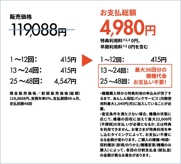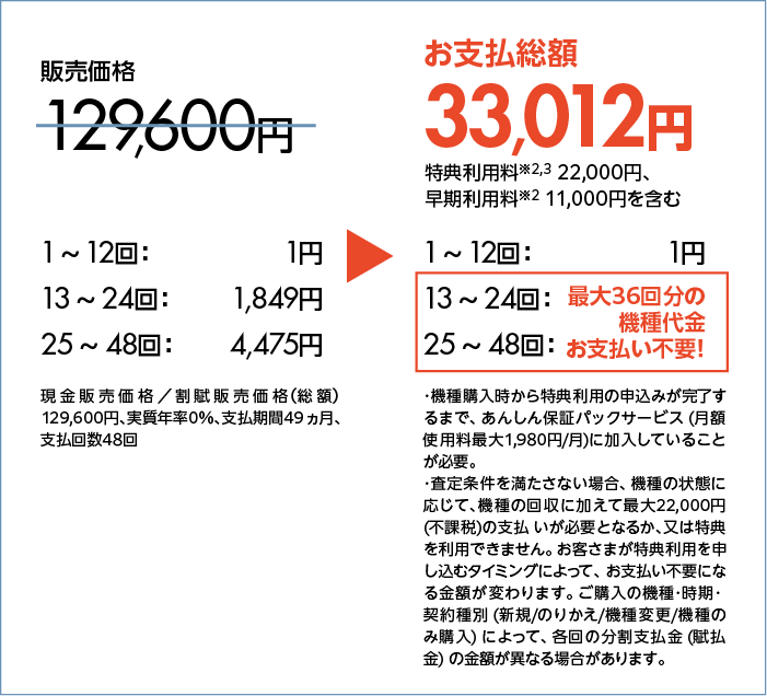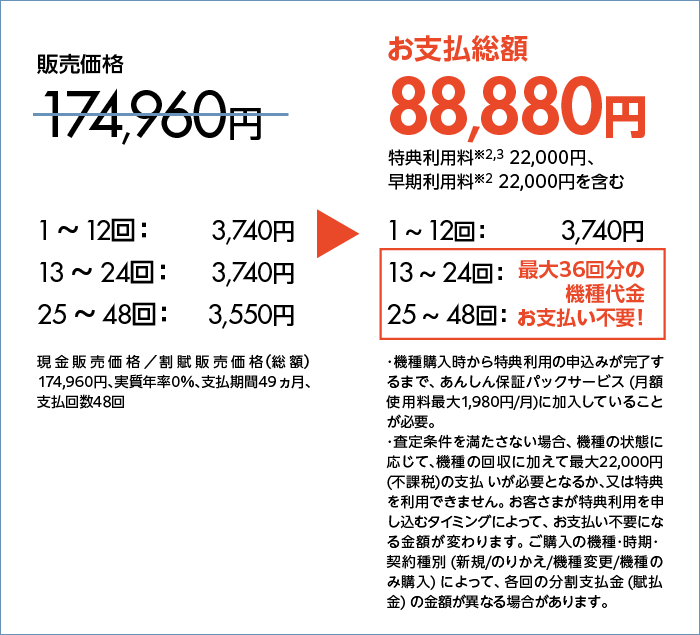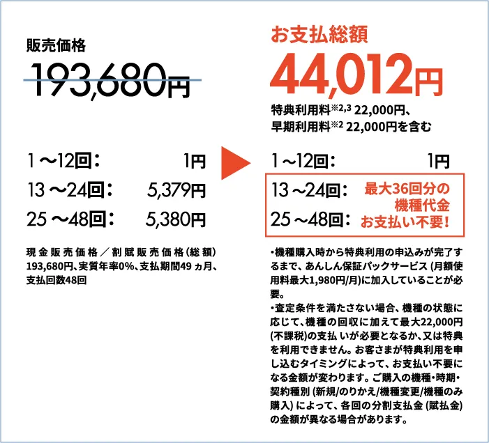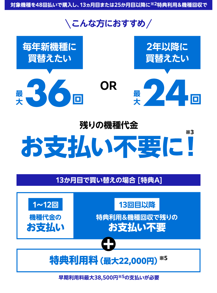 • 13ヵ月目※1に機種変更の場合【特典A】(48回割賦で対象機種を購入し、13ヵ月目※以降に特典利用を申込み、