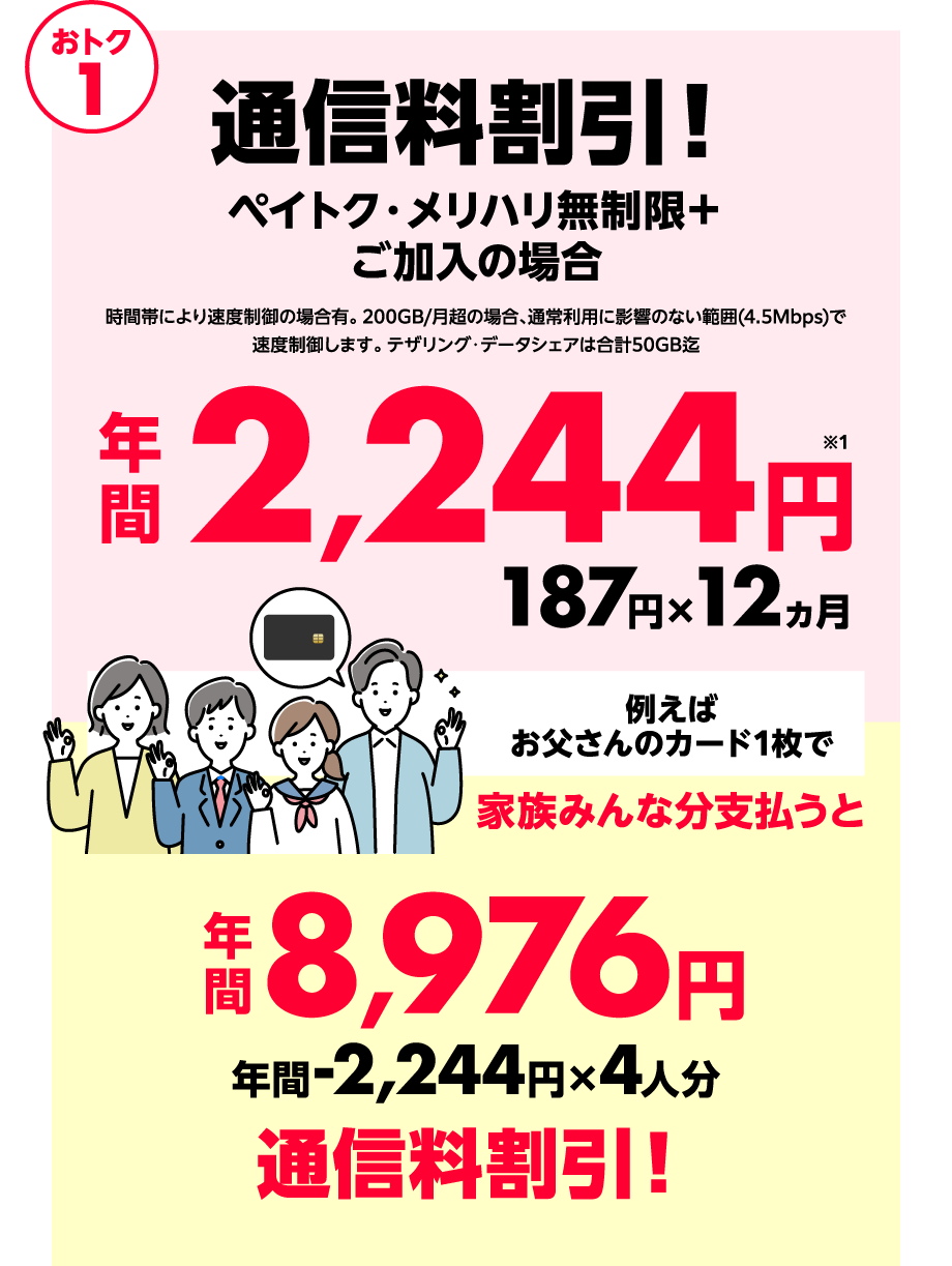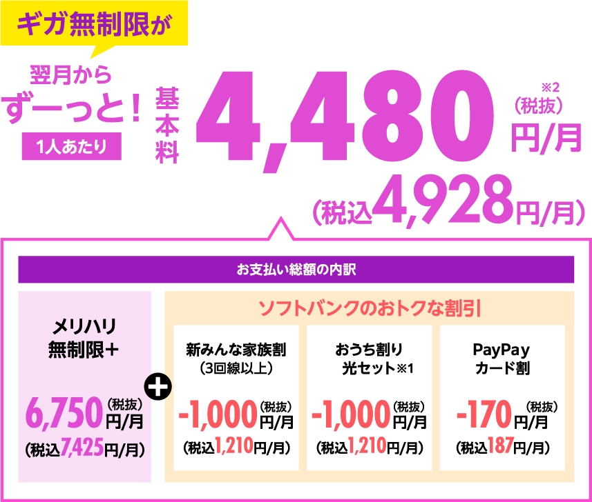 【メリハリ無制限+】※最大4.5Mbpsに制御します。※1 通話従量制(22円/30 秒)。ナビダイヤル(0570から始まる番号)など一部対象外通話あり。※2【加入例】SoftBank 光 ファミリー(2年契約自動更新・2022年7月1日以降の契約者は、契約期間満了月の月~翌々月以外での解約には解除料 5,720円が必要、2022年6月30日以前の契約者は同10,45円が必要)の場合5,720円/月+指定オプション 550円/月~が別途必要です。【データプランメリハリ無制限+】・3G 専用機種など一部対象外機種があります。・テザリング・データシェアでのご利用のデータ量が合計50GB/月を超えた場合、請求月末まで通信速度を送受信時最大 300Kbps に低速化いたします。・SMS、海外でのご利用分などは対象外です。・ソフトバンクを既にご利用中のお客さまが申し込みする場合は、翌請求月から適用されます(一部異なる場合があります。詳しくは提供条件書をご確認ください)。・加入月に解約する場合を除き、解約月の定額料は日割計算しません。・ご利用のデータ量が 2GB 以下の場合の割引は、日割計算します。・スマホ通信で 200GB/月を超えた場合の通信速度制御は追加データをチャージ(購入)いただいても通常速度に戻りません。・余ったデータ量を翌請求月以降に繰り越して利用することはできません。・ネットワークサービスの安定的な提供のため、時間帯により、動画、ゲーム等のサービス、AR(拡張現実)等の機能を用いたサービス、その他トラヒックの混雑を生じさせるおそれのあるサービスのご利用にあたり 、通信速度を制御することがあります。・通信が混雑し、または通信の混雑が生じる可能性がある場合、ネットワーク全体の品質を確保するため、通信の種類および内容にかかわらず、 通信速度を制御することがあります。・テザリング以外の通信でも環境・技術的な要因等によってテザリングとしてデータ通信量がカウントされる場合があります。・家族データシェア・法人データシェアは対象外です。・5G通信サービスを利用するためには、5G対応機種が必要です。【おうち割 光セット】対象固定通信サービス1回線に対して、最大10回線が対象です。本キャンペーンと「家族おトク割」または「複数回線割引」の適用条件を満たす場合、割引額が大きい方のみを適用します。「新 Wi-Fi セット割」、「Wi-Fi セット割」、「U25ボーナス」、「Pocket WiFi セット割」及び「おうち割 光セット モバイル Wi-Fi ルーター特典」との併用はできません。「電話番号・メールアドレスお預かりサービス」に加入した場合、適用条件を満たしていなかった場合など、前請求月をもって本キャンペーンの割引は終了します。固定通信サービスのお申し込み後 180日経過後も、固定通信サービスの契約成立が当社にて確認されない場合、本キャンペーンは、適用開始日に遡って自動的に解除されます。【新みんな家族割】・ご契約回線を譲渡された場合や2023年5月17日以降に「電話番号・メールアドレスお預かりサービス」に加入されたときは、前請求月の適用をもって割引を終了します。・「家族データシェア」、「家族おトク割」などの一部サービスは併用できません。【PayPayカード割】・適用条件:請求締日時点で、PayPayカード又はPayPayカード ゴールドが、ご利用料金のお支払い方法として適用されているとき。※家族カードも対象です。・請求代行サービスを利用している場合、適用されません。・割引対象データプランの定額料が日割となる場合、本割引サービスの割引額は日割となります。・「電話番号・メールアドレスお預かりサービス」に加入した場合、譲渡・承継又は解約された場合等は、前請求月で割引は終了します。