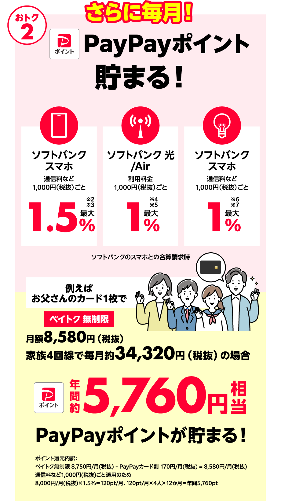 ※4:SoftBank 光/Airのみをご利用のお客さまは1%となり、PayPayポイントでの付与となります。PayPayポイントはご利用料金200円(税込)ごとに付与。
